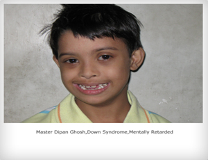 Master Dipan Ghosh, aged 10 years is a Down Syndrome boy. He is having father Mr Samir Ghosh and elder sister. They live at a Village PO-Bishnupur, South 24 parganas, Pin-743503. His mother Mrs. Mithun Ghosh died in 2005 after a long spell of illness and thus his elder sister looks after him.