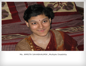 Ms. AMRITA SAHA BHAUMIK, elder daughter of Mr. and Mrs. Barun Saha Bhaumik of 311C, Ramkrishna Sarani, Behala, Kolkata-700060.She was born on 26.07.1986 as lakshmi of the family. There was no noticeable physical problem of Amrita. But even after six months of age, she could not move either side and could not hold any thing, unable to sit and then her parents doubted some problems with Amrita. Ultimately Doctors diagnosed Amrita suffering from Cerebral Palsy. At later age while she was unable speak and showed poor level of intelligence then it was found that she was suffering from Mental Retardation. Ultimately Amrita was diagnosed suffering from Multiple Disabilities.